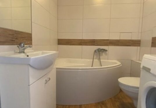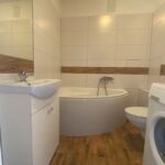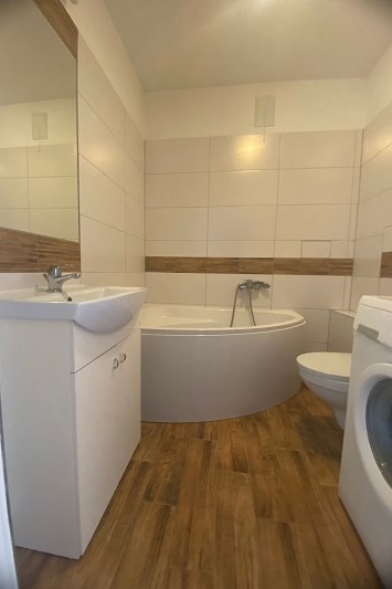 • łazienka: wanna narożna, pralka, umywalka z szafką i lustrem, Geberit
