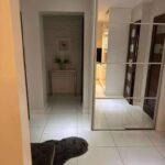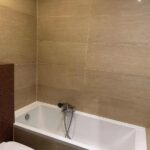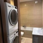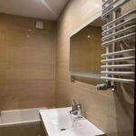 Wyposażona w wannę, zabudowę meblową, lustro, szafkę z umywalką i armaturę Geberit. W łazience znajduje się również pralka.