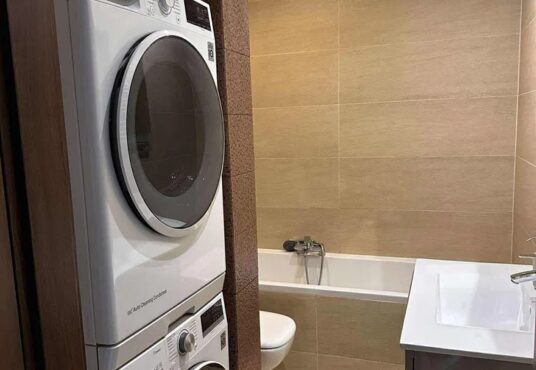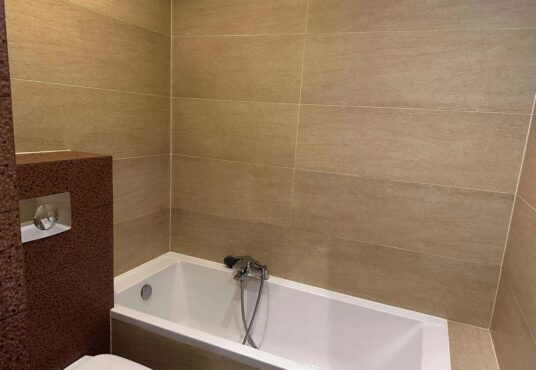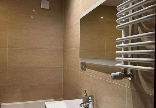 Wyposażona w wannę, zabudowę meblową, lustro, szafkę z umywalką i armaturę Geberit. W łazience znajduje się również pralka.