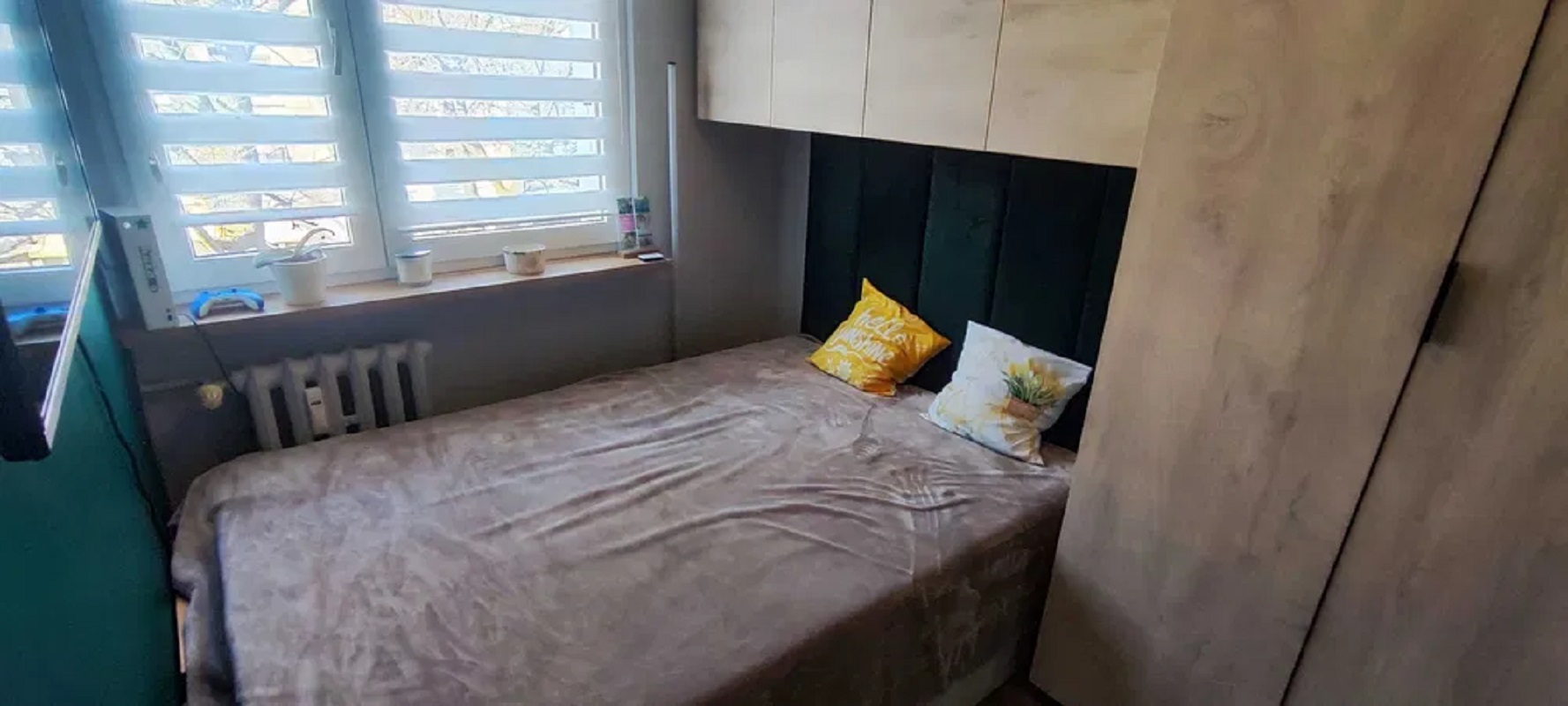 * sypialnia z łóżkiem 140×200 i meblami w zabudowie,