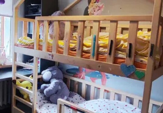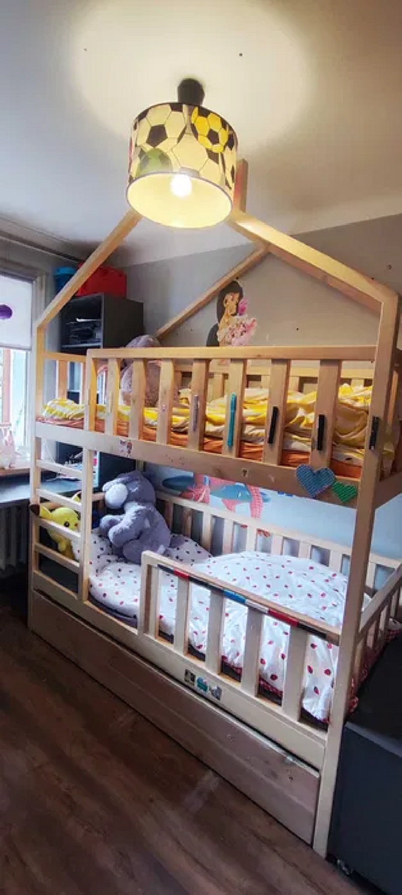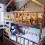 * pokój dziecięcy z łóżkiem piętrowym, szafami, biurkiem i regałem,