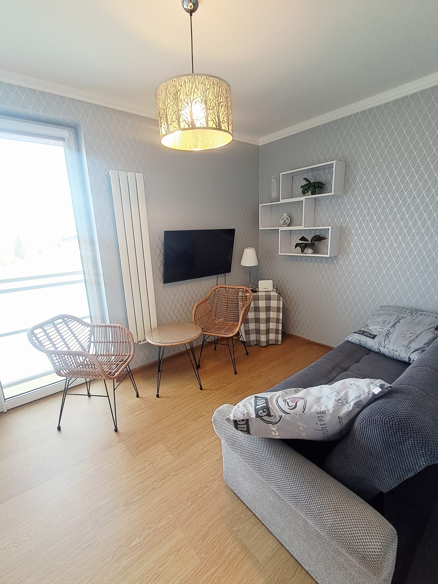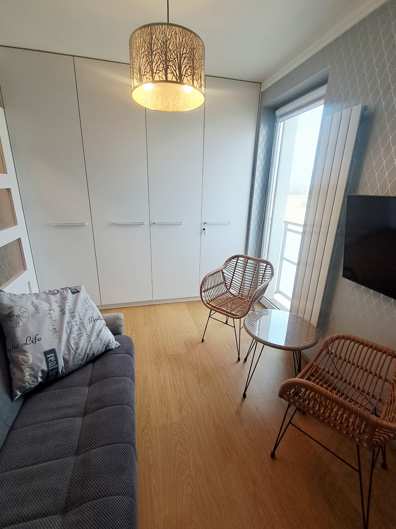 * przestronny salon z wyjściem na duży balkon,