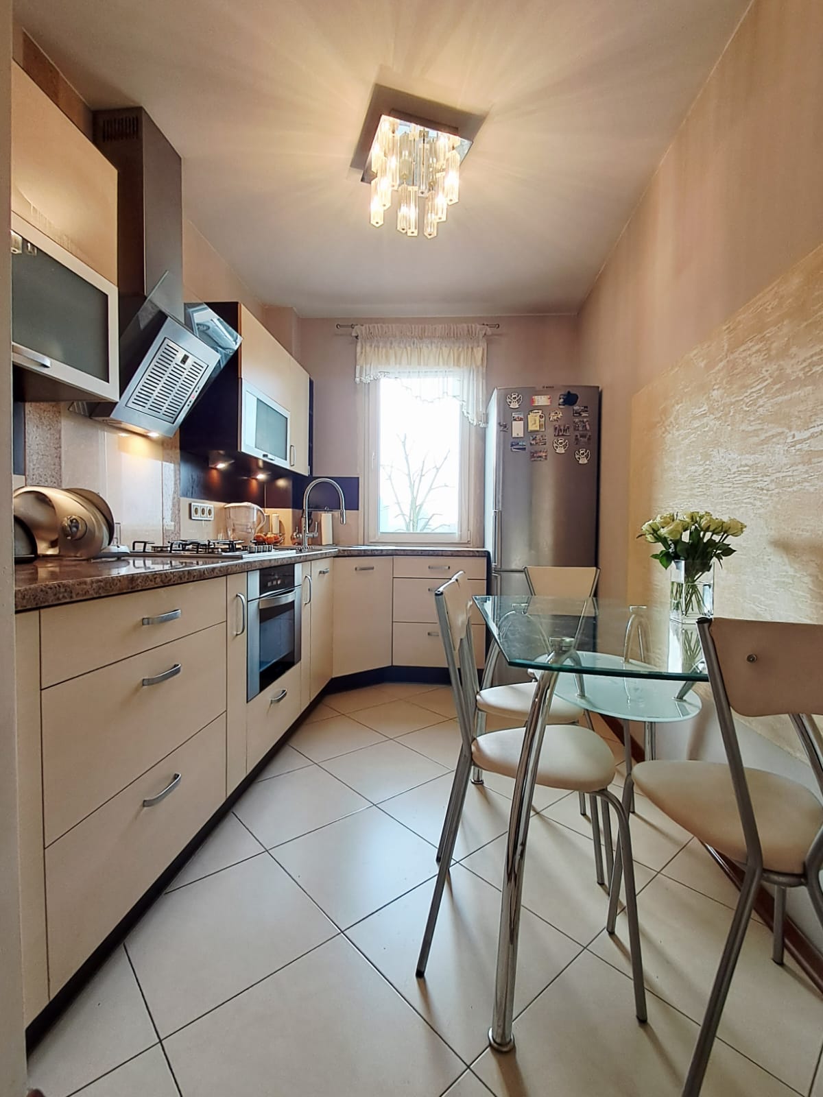* kuchnia wyposażona w meble na wymiar, płytę gazową, piekarnik elektryczny z mikrofalówką, okap, zmywarką w zabudowie, lodówką, stołem z krzesłami,