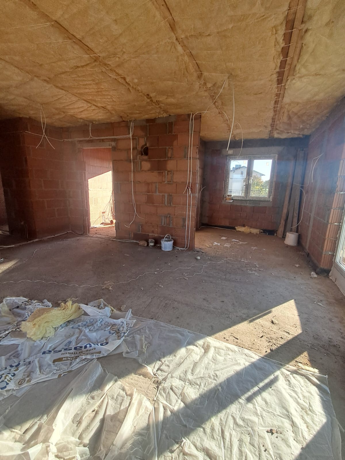 * Ściany z pustaka ceramicznego, ocieplone styropianem o grubości 15 cm, wykończone na biało