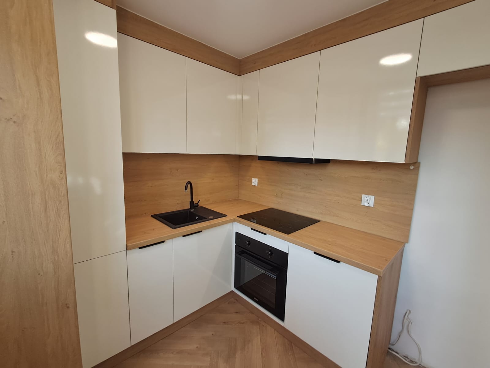 * Kuchnia w zabudowie z nowym sprzętem AGD: płyta elektryczna, pochłaniacz, piekarnik elektryczny,