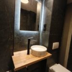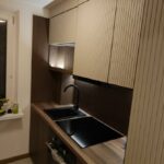 Kuchnia została wyposażona w meble w zabudowie oraz sprzęt AGD: płytę indukcyjną, piekarnik elektryczny oraz pochłaniacz. Łazienka urządzona estetycznie, z funkcjonalną wanną.
