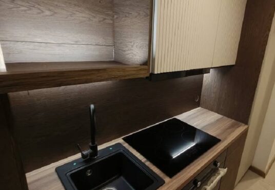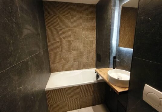 Kuchnia została wyposażona w meble w zabudowie oraz sprzęt AGD: płytę indukcyjną, piekarnik elektryczny oraz pochłaniacz. Łazienka urządzona estetycznie, z funkcjonalną wanną.