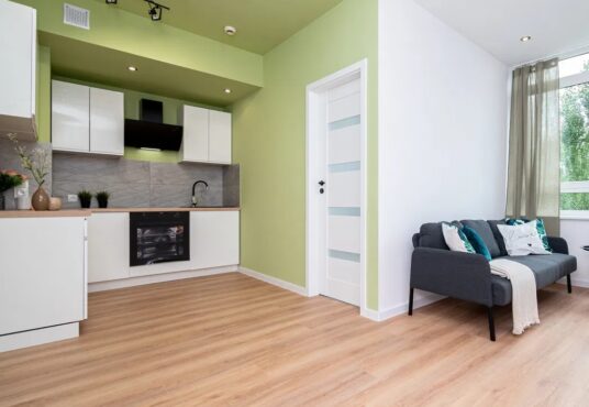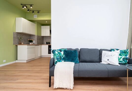 • jasny pokój dzienny z aneksem kuchennym, idealny do codziennego wypoczynku,